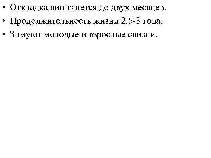 • Откладка яиц тянется до двух месяцев. • Продолжительность жизни 2, 5 -3 года. • Зимуют молодые и взрослые слизни.