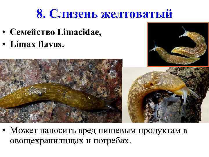 8. Слизень желтоватый • Семейство Limacidae, • Limax flavus. • Может наносить вред пищевым продуктам в овощехранилищах и погребах.