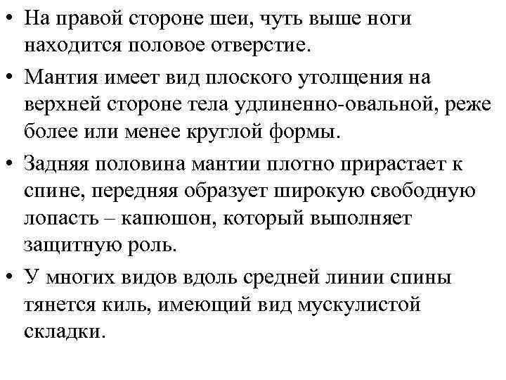 • На правой стороне шеи, чуть выше ноги находится половое отверстие. • Мантия имеет вид плоского утолщения на верхней стороне тела удлиненно-овальной, реже более или менее круглой формы. • Задняя половина мантии плотно прирастает к спине, передняя образует широкую свободную лопасть – капюшон, который выполняет защитную роль. • У многих видов вдоль средней линии спины тянется киль, имеющий вид мускулистой складки.