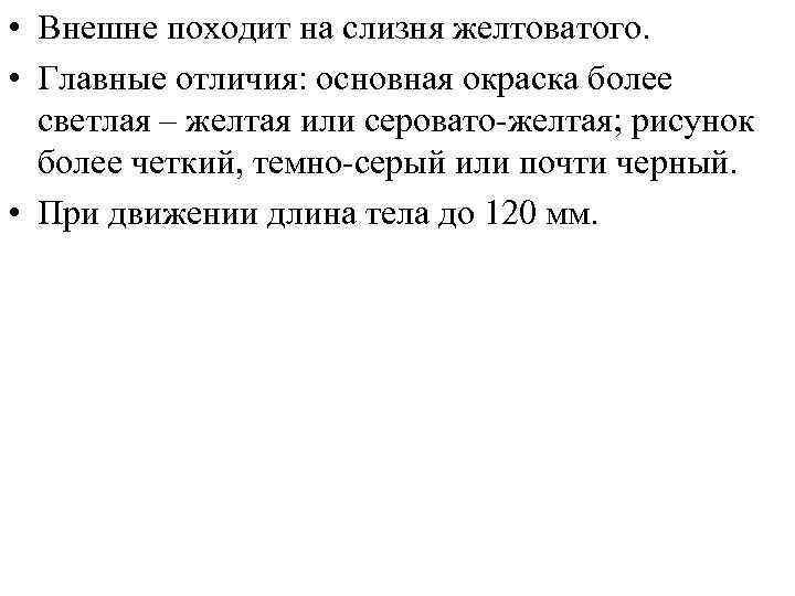 • Внешне походит на слизня желтоватого. • Главные отличия: основная окраска более светлая – желтая или серовато-желтая; рисунок более четкий, темно-серый или почти черный. • При движении длина тела до 120 мм.