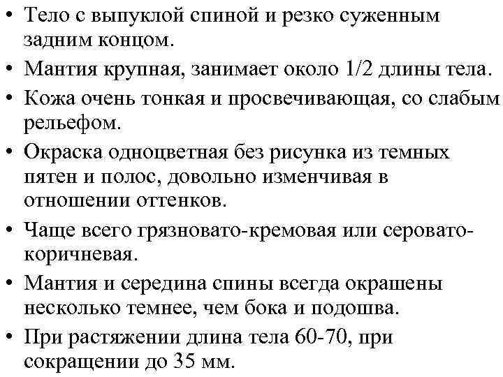 • Тело с выпуклой спиной и резко суженным задним концом. • Мантия крупная, занимает около 1/2 длины тела. • Кожа очень тонкая и просвечивающая, со слабым рельефом. • Окраска одноцветная без рисунка из темных пятен и полос, довольно изменчивая в отношении оттенков. • Чаще всего грязновато-кремовая или сероватокоричневая. • Мантия и середина спины всегда окрашены несколько темнее, чем бока и подошва. • При растяжении длина тела 60 -70, при сокращении до 35 мм.