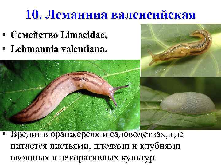10. Леманниа валенсийская • Семейство Limacidae, • Lehmannia valentiana. • Вредит в оранжереях и садоводствах, где питается листьями, плодами и клубнями овощных и декоративных культур.