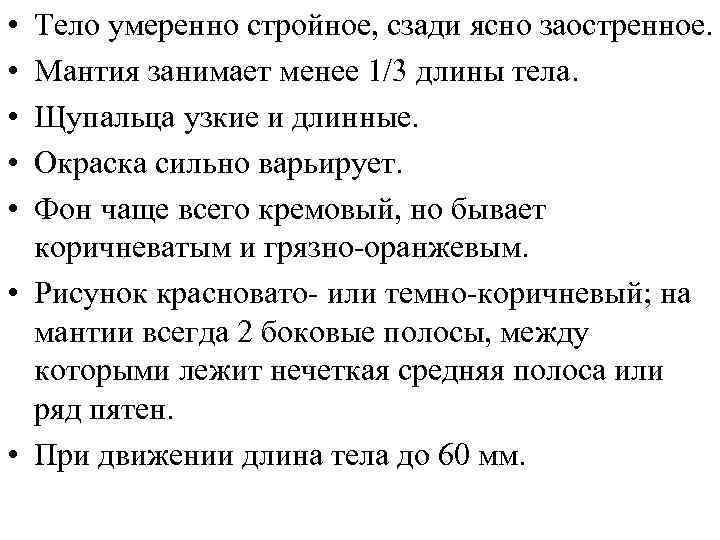 • • • Тело умеренно стройное, сзади ясно заостренное. Мантия занимает менее 1/3 длины тела. Щупальца узкие и длинные. Окраска сильно варьирует. Фон чаще всего кремовый, но бывает коричневатым и грязно-оранжевым. • Рисунок красновато- или темно-коричневый; на мантии всегда 2 боковые полосы, между которыми лежит нечеткая средняя полоса или ряд пятен. • При движении длина тела до 60 мм.