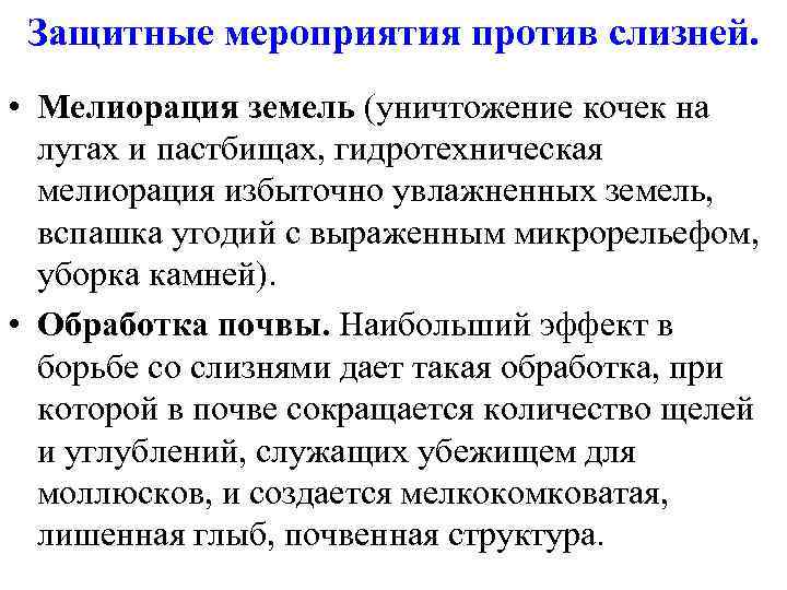Защитные мероприятия против слизней. • Мелиорация земель (уничтожение кочек на лугах и пастбищах, гидротехническая мелиорация избыточно увлажненных земель, вспашка угодий с выраженным микрорельефом, уборка камней). • Обработка почвы. Наибольший эффект в борьбе со слизнями дает такая обработка, при которой в почве сокращается количество щелей и углублений, служащих убежищем для моллюсков, и создается мелкокомковатая, лишенная глыб, почвенная структура.