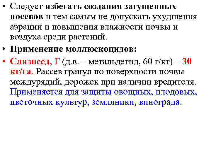 • Следует избегать создания загущенных посевов и тем самым не допускать ухудшения аэрации и повышения влажности почвы и воздуха среди растений. • Применение моллюскоцидов: • Слизнеед, Г (д. в. – метальдегид, 60 г/кг) – 30 кг/га. Рассев гранул по поверхности почвы междурядий, дорожек при наличии вредителя. Применяется для защиты овощных, плодовых, цветочных культур, земляники, винограда.