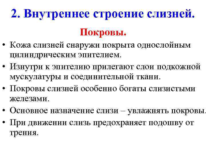 2. Внутреннее строение слизней. Покровы. • Кожа слизней снаружи покрыта однослойным цилиндрическим эпителием. • Изнутри к эпителию прилегают слои подкожной мускулатуры и соединительной ткани. • Покровы слизней особенно богаты слизистыми железами. • Основное назначение слизи – увлажнять покровы. • При движении слизь предохраняет подошву от трения.