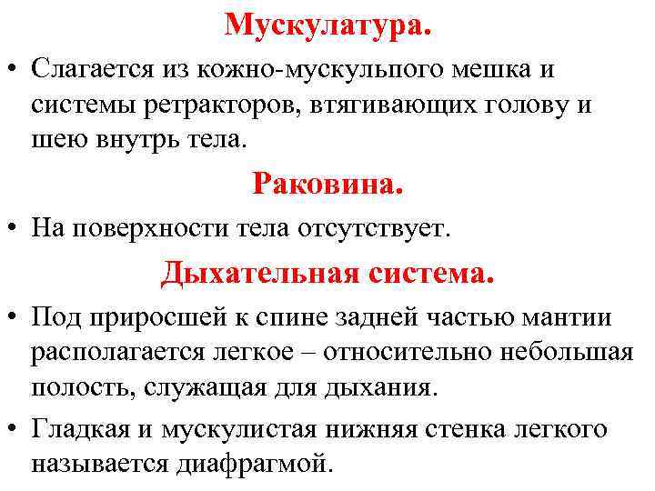 Мускулатура. • Слагается из кожно-мускульпого мешка и системы ретракторов, втягивающих голову и шею внутрь тела. Раковина. • На поверхности тела отсутствует. Дыхательная система. • Под приросшей к спине задней частью мантии располагается легкое – относительно небольшая полость, служащая для дыхания. • Гладкая и мускулистая нижняя стенка легкого называется диафрагмой.