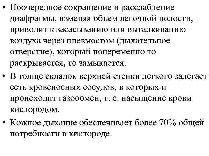 • Поочередное сокращение и расслабление диафрагмы, изменяя объем легочной полости, приводит к засасыванию или выталкиванию воздуха через пневмостом (дыхательное отверстие), который попеременно то раскрывается, то замыкается. • В толще складок верхней стенки легкого залегает сеть кровеносных сосудов, в которых и происходит газообмен, т. е. насыщение крови кислородом. • Кожное дыхание обеспечивает более 70% общей потребности в кислороде.