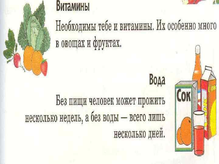 «В повседневном питании обеспечить определенное соотношение между отдельными компонентами пищи, не забывая об определенном минимуме белков» . «В ежедневном рационе должны быть блюда, содержащие клетчатку – овощи типа свеклы, . капусты, редьки, хлеб грубого помола, фрукты, морковь и т. д. » Не забывать об употреблении витаминов и минеральных веществ. Для этого питание должно быть разнообразным и включать свежие фрукты и всевозможные овощи» . «Не забывать о необходимом количестве воды. В нормальных условиях человек нуждается в 2 -х литрах воды, включая суп, чай, молоко, кофе» .