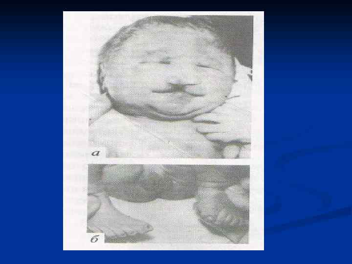 n n n Клинические проявления ХС 1. Недостаток хромосом приводит к более выраженным клиническим проявлениям, чем его избыток. 2. Для ХС по аутосомам характерны: - пренатальная гипотрофия (малый вес ребенка при доношенной беременности) - пороки развития 2 -х и более органов и систем - задержка психомоторного развития - олигофрения - увеличение стигм дизэмбриогенеза или малых аномалий развития. Например, стигмы дизэмбриогенеза: - сандалевидная щель между 1 -м и 2 -м пальцами на ногах - диастема – увеличение расстояния между передними резцами -расщепление кончика носа и др.