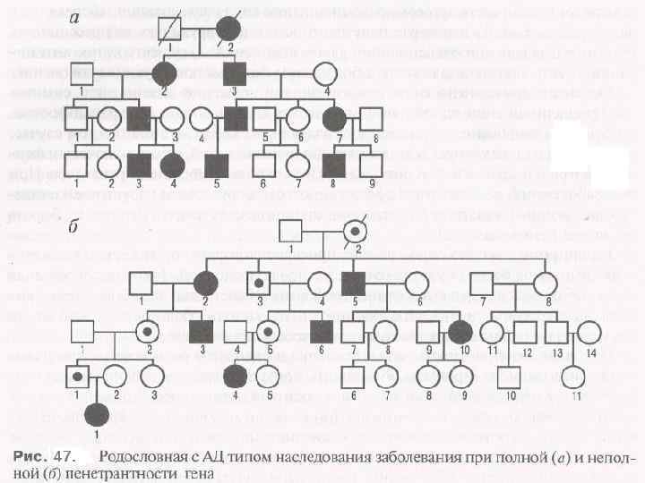 § § МБ с менделевским наследованием Они составляют только треть всех наследственных заболеваний. А-Д МБ. Признаки: Проявление заболевания у гетеро- и гомозигот по патологической мутации Передача мутантного гена от родителей к детям обоего пола с вероятностью 50%