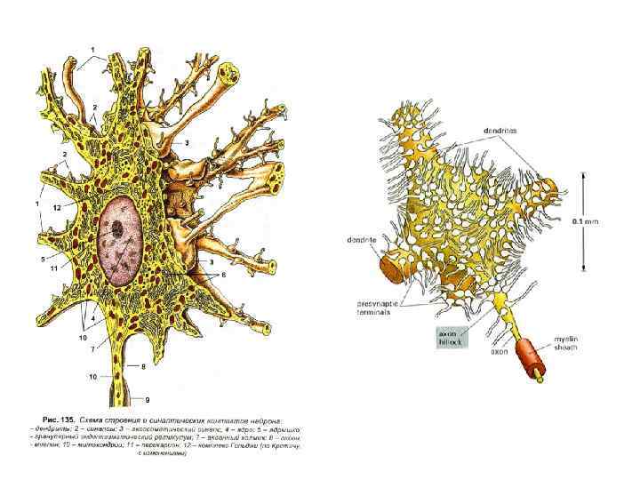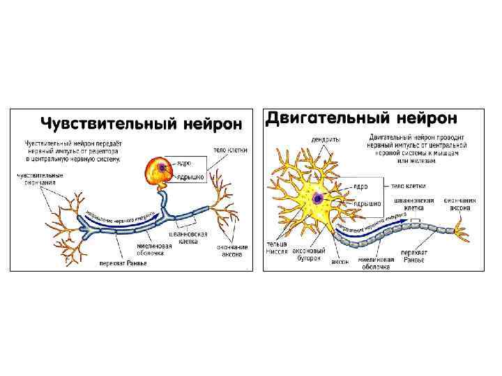Нервная ткань: Нейроны состоят из тела и отростков — длинного, по которому возбуждение идет от тела клетки — аксона и дендритов, по которым возбуждение идет к телу клетки.