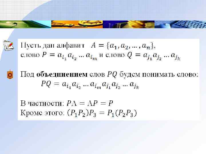 Алфавитом будем называть любое непустое множество. Его элементы называются буквами, а любая последовательность букв – словами в данном алфавите Для удобства рассуждений допускается пустое слово, которые обозначим Слова будем обозначать буквами Р, Q, R и с индексами
