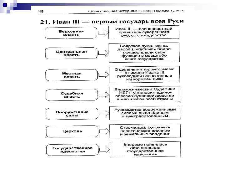 ■ «Нестяжатели» , возглавляемые старцем Кирилло-Белозерского монастыря Нилом Сорским, утверждали, что «стяжать» то есть стремиться к земным богатствам недостойно не только монахов (принцип личной бедности проповедовался в Русской православной церкви еще в XI в. ), но и духовенства вообще. Некоторое время принять аргументы Нила Сорского склонялся и сам Иван III. ■ ■ ■ «Иосифляне» , называемые так по имени своего духовного лидера, игумена Иосифа Волоцкого, защищали церковное землевладение, настаивая на том, что, во-первых, богатства монастырей — это богатства Божьи, а во-вторых, если запретить обителям принимать земельные пожертвования, то «как честному и благородному человеку постричься? » . В обмен на поддержку своего авторитета великий князь отказался от мысли конфисковать монастырские имения, и на соборе 1504 г. нестяжатели были осуждены как еретики. С тех пор иосифляне стали верной опорой царской власти.