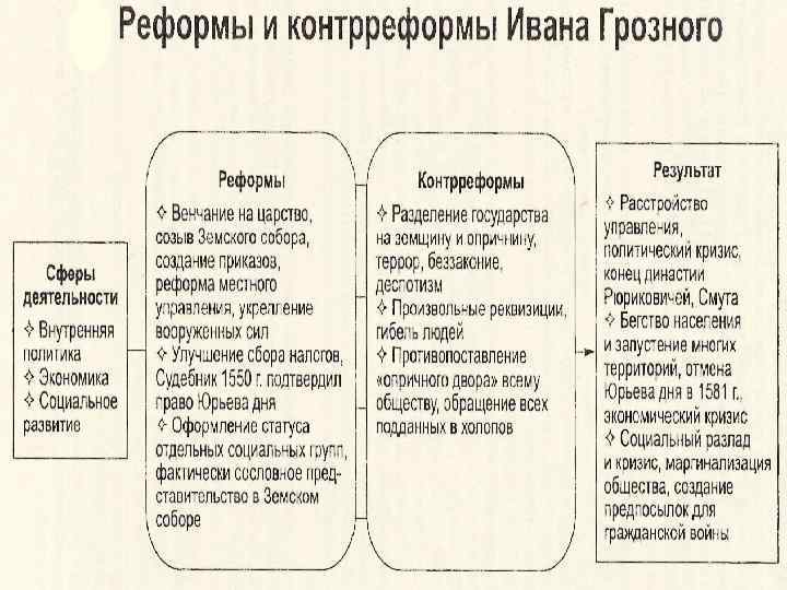 n Церковная реформа. В 1551 г. по инициативе Ивана Грозного был созван Собор русской православной церкви, получивший название Стоглавого, поскольку его решения были сведены в сто глав. Собор сделал едиными для всей страны церковные обряды, провозгласил неприкосновенность церковных имуществ и неподсудность духовенства светским властям. Ограничил церковные владения в городах и финансовые привилегии духовенства. В дальнейшем церковь могла покупать земли или получать их в дар только с царского разрешения.