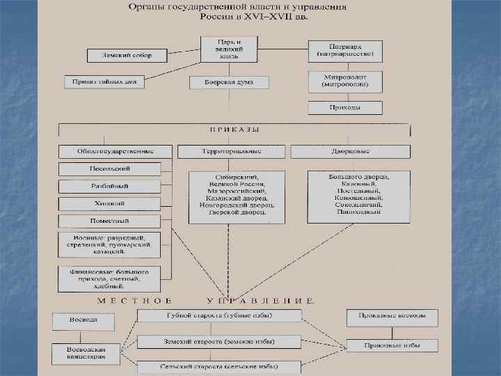 n Реформа центрального управления. Завершено формирование приказной системы управления, построенной на отраслевом принципе. Приказы представляли собой центральные органы исполнительной власти, ведавшие отраслями государственного управления или отдельными регионами страны. Во второй полови не XVI в. существовало уже более двух десятков приказов, важнейшими из которых были: Посольский (иностранные дела), Разрядный (поместное войско), Пушкарский (управление артиллерией), Стрелецкий (стрелецкое войско), Челобитный (рассматривал жалобы на имя царя), Разбойный (ведал розыском и судом над «лихими» людьми) и др. Во главе приказа стоял боярин или дьяк крупный государственный чиновник. С усложнением задач государственного управления количество приказов росло.