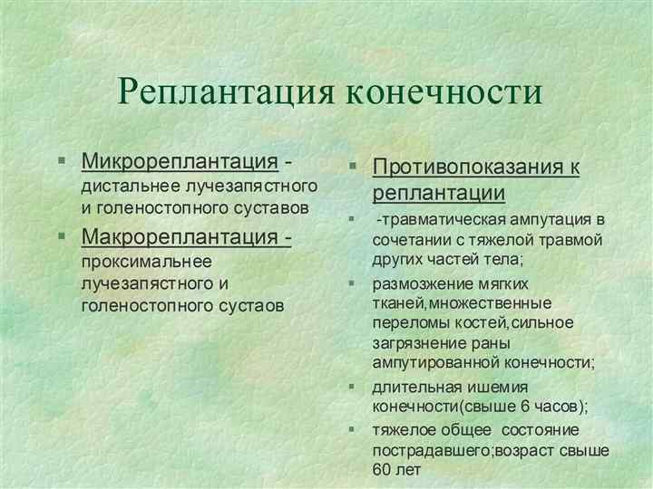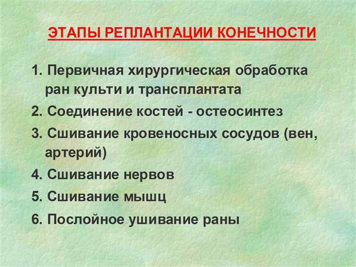 ХИРУРГИЧЕСКАЯ ОПЕРАЦИЯ (ВИДЫ) По оперативному приему: - анастомоз (anastomosis - соустье) – искусственное соустье между полыми органами (гастроэнтероанастомоз, энтероанастомоз и пр. ); - ампутация (аmputare - отсекать) – отсечение периферической части конечности на протяжении кости или периферической части органа (ампутация голени в средней трети, надвлагалищная ампутация матки и пр. ); - реплантация (re -вновь, plantare - сажать) – присоединение к организму отсеченной в результате травмы части тела (реплантация конечности, реплантация кончика носа и пр. ); - трансплантация (transplantare - пересаживать) – перемещение (пересадка) органов или тканей одного организма в другой, или в пределах одного организма (аутотрансплантация кожи, аллотрансплантация почки, сердца, костного мозга и пр. ); - протезирование (prothesis - прикрепление, присоединение) – замена патологически измененного органа или его части искусственными аналогами (протезирование тазобедренного сустава металлическим протезом, протезирование бедренной артерии). - пластика (plastike - ваяние, формирование) – ликвидация дефектов в органе или тканях с использованием биологических или искусственных материалов (пластика пахового канала, торакопластика и пр. )