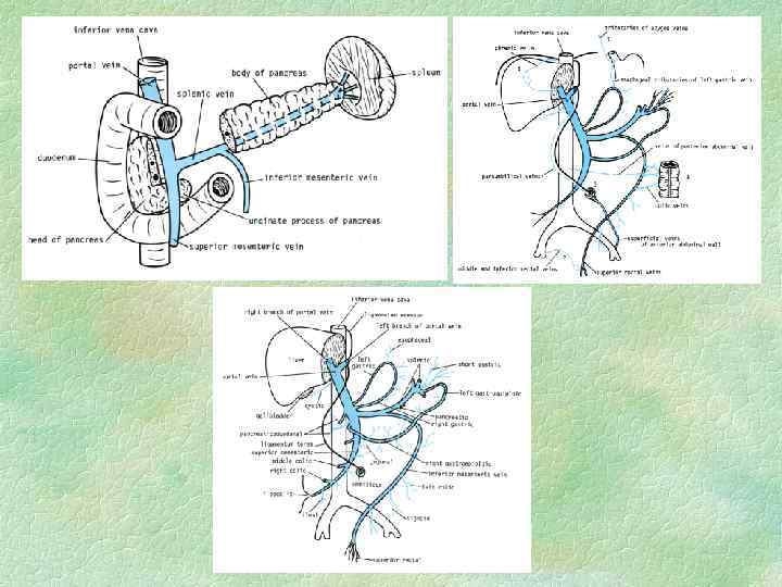 ОСОБЕННОСТИ КРОВОСНАБЖЕНИЯ ПЕЧЕНИ 1. Наличие двух венозных систем - портальной (портальные ворота печени) и кавальной (кавальные ворота печени) 2. Несовпадение хода сосудов двух систем (артериальной и венозной). Ветви печеночных вен (v. v. hepaticae) не следуют ретроградно по пути печеночных артерий - проходят между ними и веерообразно сходятся в точке, ориентированной к v. cava inferior (кавальные ворота) 3. Наличие двух приносящих кровеносных сосудов - a. hepatica propria и v. portae (портальные ворота) 4. Слабое развитие внутрипеченочных анастомозов возможность некроза участка печени при перевязке ветви внепеченочной артерии