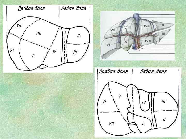СЕГМЕНТАРНОЕ СТРОЕНИЕ ПЕЧЕНИ Сегмент - участок печени, имеющий до некоторой степени обособленное кровоснабжение, желчный отток и лимфоотток Деление на сегменты с учетом ветвления элементов портальной системы (v. portae, a. hepatica propria, ductus hepaticus) - анатомически более обосновано и чаще используется в хирургической практике. Схема сегментарного строения печени по Couinaud (1957) 2 доли 5 секторов 8 сегментов