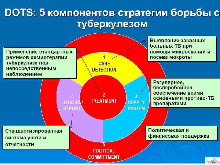 Основные элементы стратегии DOTS • Политическая поддержка данной стратегии властями всех уровней и обязательство правительства обеспечить реализацию мероприятий по борьбе с туберкулезом • Выявление случаев туберкулеза с помощью бактериоскопического исследования мазков мокроты у больных, имеющих симптомы заболевания (по обращаемости) • Проведение лечения по стандартизированным схемам под непосредственным контролем в течение всего курса химиотерапии • Регулярные, бесперебойные поставки всех основных противотуберкулезных препаратов • Стандартизированная система регистрации и отчетности, позволяющая проводить оценку результатов у каждого больного и эффективности программы борьбы с туберкулезом в целом.