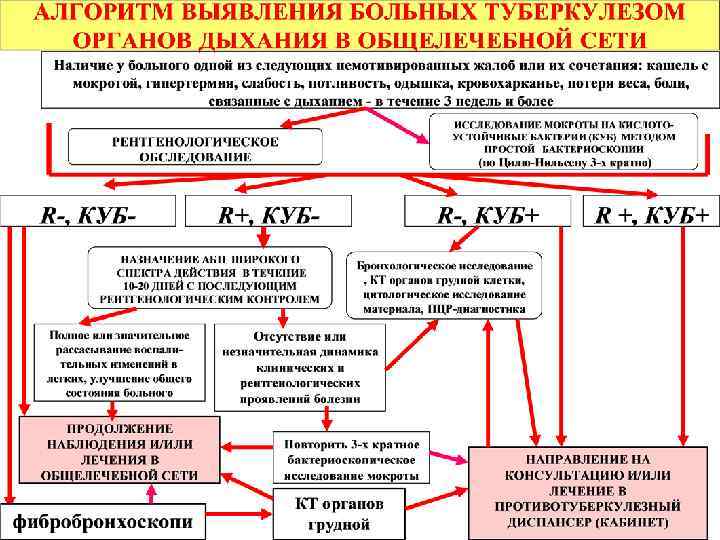 Алгоритм диагностики туберкулеза органов дыхания в стационарах общелечебной сети Больные с острым воспалительным заболеванием легких 1. Анамнез 3. Рентгенограмма органов грудной клетки 2. Клиническое обследование 4. Исследование 3 проб мокроты 3 дня подряд методом микроскопии мазка по Цилю-Нильсену Результат положительный Перевод в противотуберкулезное учреждение для проведения химиотерапии Результат отрицательный Лечение антибиотиками, как пневмонию Через 2 недели 1. Повторить рентгенограмму органов грудной клетки 2. Повторить исследование 3 проб мокроты 3 дня подряд методом микроскопии по Цилю-Нильсену Результат положительный Перевод в противотуберкулезное учреждение для проведения химиотерапии Результат отрицательный 1. Бронхоскопия с аспирационной и щеточной биопсией 2. Цитологическое исследование окраска биоптата на МБТ Результат отрицательный Продолжить лечение, как пневмонию