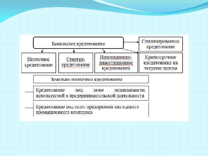 Классификация банковских кредитов по субъектам кредитования, ᅟ по связи кредита с движением капитала, ᅟ по экономическому назначению и целевому использованию по источникам привлечения, ᅟ по сфере применения, ᅟ по срокам, ᅟ по виду и характеру процентной ставки, ᅟ по порядку начисления и погашения процентов, ᅟ по характеру обеспечения кредита, ᅟ по размеру кредита, ᅟ по валюте кредитования, ᅟ по способу выдачи кредита по условиям погашения, ᅟ по числу кредиторов по формам предоставления.