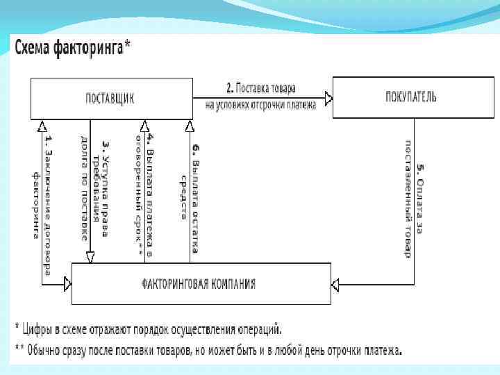 Факторинг «фактор» от английского - «посредник, маклер» Комплекс финансовых услуг, оказываемых клиенту в обмен на уступку дебиторской задолженности. Комплекс услуг включает в себя: • финансирование поставок товаров; • страхование кредитных рисков; • учет состояния дебиторской задолженности; • работу с дебиторами по своевременной оплате. Факторинг дает возможность покупателю отсрочить платежи, а поставщику получить основную часть оплаты за товар стразу после его поставки