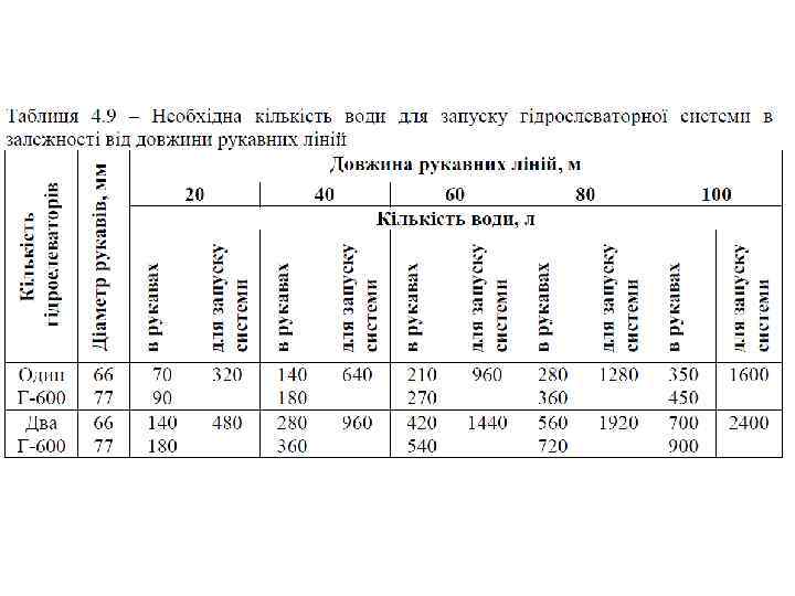 1. Об’єм води в гідроелеваторній системі залежить від сумарної кількості напірних пожежних рукавів у системі та визначається за формулою: де: Vсист – об’єм води в гідроелеваторній системі, л; Nр – кількість напірних пожежних рукавів у гідроелеваторній системі, шт; Vр – об’єм води в одному напірному пожежному рукаві довжиною 20 м
