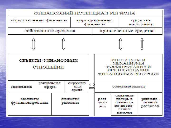 Финансовый потенциал региона Основу финансового потенциала региона составляют общественные, корпоративные и частные финансовые средства. Объектами приложения этих средств является экономика, социальная сфера, окружающая среда. Формирование и использование этих ресурсов обеспечивается системой финансовых институтов и механизмов.