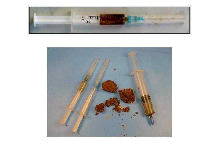 • • • Більшість наркотичних засобів опійної групи вживаються шляхом ін'єкцій, це означає, що ті хто їх використовує, мають реальний і високий ризик зараження вірусом імунодефіциту (ВІЧ/СНІДом), сифілісом, гепатитом, вірусним запаленням печінки та іншими захворюваннями, які передають ся через не продезинфіковані голки та шприци. Наркотики цієї групи виготовляються з використанням хімічних розчинників (таких як ацетон, розчинник 646, 647, 649, оцтовий ангідрид, толуол), при цьому більшість розчинників залишається у самому наркотичному розчині, який на пряму попадає в організм людини та вражає її кров’яну систему і печінку, а також серцево судинну, дихальну та нервову системи, вимиває кальцій (всі наркомани „зі стажем” беззубі). Гепатит в комбінації з постійним токсичним навантаженням від хімічних розчинників і оцтового ангідриду легко доводить печінку до дистрофії. Опійні наркотики здебільшого виготовляються кустарно і вони не бувають стерильними. Тому, в результаті внутрішньовенного вживання, в кров з розчином попадає значна кількість бруду, бактерій, мікробів та інших шкідливих мікроорганізмів, що призводить до зараження крові (сепсису). Від вживання наркотиків цієї групи дуже швидко розвивається фізична та психічна залеж ність, особливо при внутрішньовенному способі введення. Опіати толерантні, тобто потребують постійного збільшення дози для досягнення одного й того ж самого ефекту наркотичного сп’яніння, а передозування призво дить до коми і навіть смерті.