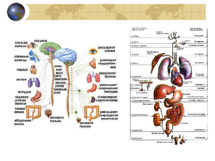 Орган зрачок Сердце Симпатическая система Расширяет Парасимпатическая система Учащает и усиливает сердце биение Урежает и ослабляет сердцебиение Сужает Сосуды сердца (коронарные сосуды) расширение Сужение Другие сосуды сужение Нет иннервации Железы (кроме потовых) Ослабляет секрецию Усиливает секрецию