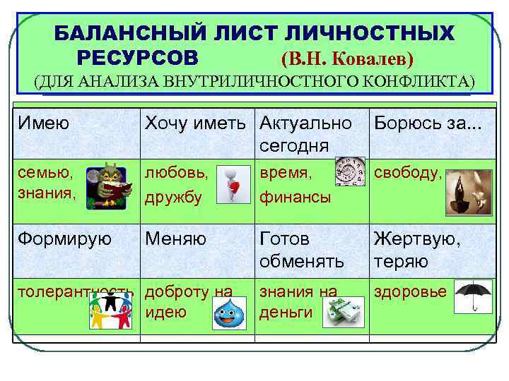 БАЛАНСНЫЙ ЛИСТ ЛИЧНОСТНЫХ РЕСУРСОВ (В. Н. Ковалев) (ДЛЯ АНАЛИЗА ВНУТРИЛИЧНОСТНОГО КОНФЛИКТА) Имею Хочу иметь Актуально сегодня Борюсь за. . . семью, знания, любовь, дружбу время, финансы свободу, Формирую Меняю Готов обменять Жертвую, теряю знания на деньги здоровье толерантность доброту на идею