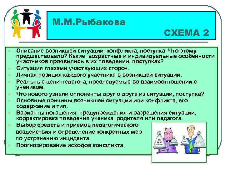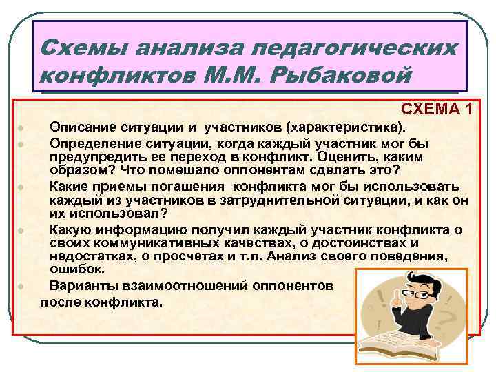 М. М. Рыбакова l l l l l СХЕМА 2 Описание возникшей ситуации, конфликта, поступка. Что этому предшествовало? Какие возрастные и индивидуальные особенности участников проявились в их поведении, поступках? Ситуация глазами участвующих сторон. Личная позиция каждого участника в возникшей ситуации. Реальные цели педагога, преследуемые во взаимоотношении с учеником. Что нового узнали оппоненты друг о друге из ситуации, поступка? Основные причины возникшей ситуации или конфликта, его содержание и тип. Варианты погашения, предупреждения и разрешения ситуации, корректировка поведения ученика, родителя или педагога. Выбор средств и приемов педагогического воздействия и определение конкретных мер по устранению инцидента. Прогнозирование исходов конфликта.