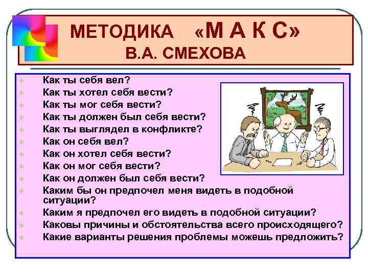 МЕТОДИКА «М А К С» В. А. СМЕХОВА l l l l Как ты себя вел? Как ты хотел себя вести? Как ты мог себя вести? Как ты должен был себя вести? Как ты выглядел в конфликте? Как он себя вел? Как он хотел себя вести? Как он мог себя вести? Как он должен был себя вести? Каким бы он предпочел меня видеть в подобной ситуации? Каким я предпочел его видеть в подобной ситуации? Каковы причины и обстоятельства всего происходящего? Какие варианты решения проблемы можешь предложить?