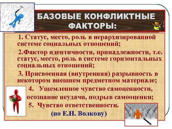 БАЗОВЫЕ КОНФЛИКТНЫЕ ФАКТОРЫ: 1. Статус, место, роль в иерархизированной системе социальных отношений; 2. Фактор идентичности, принадлежности, т. е. статус, место, роль в системе горизонтальных социальных отношений; 3. Присвоенная (внутренняя) разрывность в некотором внешнем предметном материале; 4. Ущемленное чувство самоценности, осознание неудачи, подрыв самооценки; 5. Чувство ответственности. (по Е. Н. Волкову)