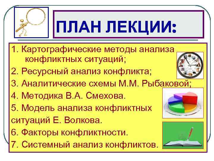 ПЛАН ЛЕКЦИИ: 1. Картографические методы анализа конфликтных ситуаций; 2. Ресурсный анализ конфликта; 3. Аналитические схемы М. М. Рыбаковой; 4. Методика В. А. Смехова. 5. Модель анализа конфликтных ситуаций Е. Волкова. 6. Факторы конфликтности. 7. Системный анализ конфликтов.