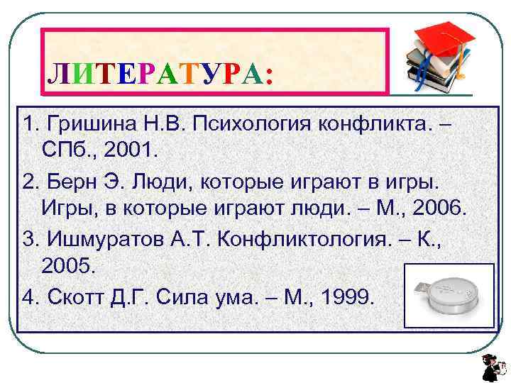 ЛИТЕРАТУРА: 1. Гришина Н. В. Психология конфликта. – СПб. , 2001. 2. Берн Э. Люди, которые играют в игры. Игры, в которые играют люди. – М. , 2006. 3. Ишмуратов А. Т. Конфликтология. – К. , 2005. 4. Скотт Д. Г. Сила ума. – М. , 1999.
