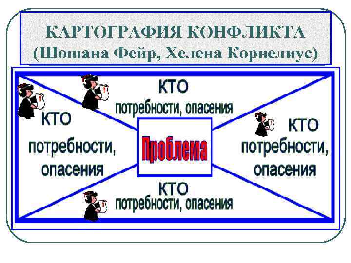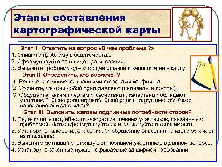 Этапы составления картографической карты Этап I. Ответить на вопрос «В чем проблема ? » 1. Опишите проблему в общих чертах. 2. Сформулируйте ее в виде противоречия. 3. Выразите проблему одной общей фразой и запишите ее в карту. Этап II. Определить, кто вовлечен? 1. Решите, кто является главными сторонами конфликта. 2. Уточните, что они собой представляют (индивиды и группы); 3. Обдумайте, какими чертами, свойствами, качествами обладают участники? Какие роли играют? Какой ранг и статус имеют? Какое положение они занимают? Этап III. Выяснить, каковы подлинные потребности сторон? 1. Перечислите потребности каждого из главных участников, связанные с проблемой. Четко сформулируйте их и ранжируйте по значимости. 2. Установите, каковы их опасения. Отображение опасений на карте означает их признание. 3. Выясните мотивацию, стоящую за позицией участников в данном вопросе. 4. Установите законные нужды, скрываемые за ширмой требований.