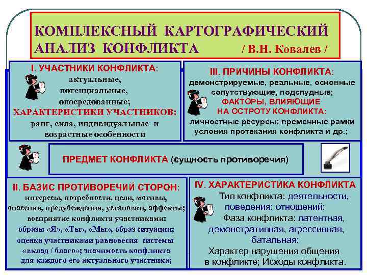 КОМПЛЕКСНЫЙ КАРТОГРАФИЧЕСКИЙ АНАЛИЗ КОНФЛИКТА / В. Н. Ковалев / I. УЧАСТНИКИ КОНФЛИКТА: УЧАСТНИКИ КОНФЛИКТА актуальные, потенциальные, опосредованные; ХАРАКТЕРИСТИКИ УЧАСТНИКОВ: ранг, сила, индивидуальные и возрастные особенности III. ПРИЧИНЫ КОНФЛИКТА: демонстрируемые, реальные, основные сопутствующие, подспудные; ФАКТОРЫ, ВЛИЯЮЩИЕ НА ОСТРОТУ КОНФЛИКТА: личностные ресурсы; временные рамки условия протекания конфликта и др. ; ПРЕДМЕТ КОНФЛИКТА (сущность противоречия) II. БАЗИС ПРОТИВОРЕЧИЙ СТОРОН: интересы, потребности, цели, мотивы, опасения, предубеждения, установки, аффекты; восприятие конфликта участниками: образы «Я» , «Ты» , «Мы» , образ ситуации; оценка участниками равновесия системы «вклад / благо» ; значимость конфликта для каждого его актуального участника; IV. ХАРАКТЕРИСТИКА КОНФЛИКТА Тип конфликта: деятельности, поведения; отношений; Фаза конфликта: латентная, демонстративная, агрессивная, батальная; Характер нарушения общения в конфликте; Исходы конфликта.