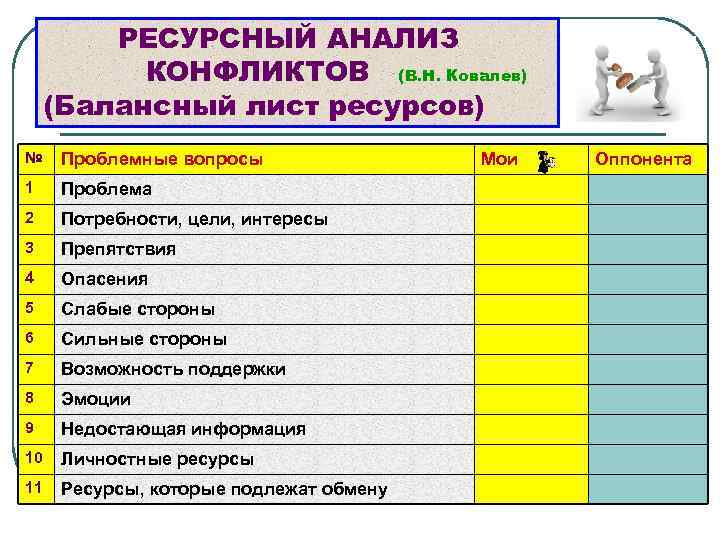 РЕСУРСНЫЙ АНАЛИЗ КОНФЛИКТОВ (В. Н. Ковалев) (Балансный лист ресурсов) № Проблемные вопросы 1 Проблема 2 Потребности, цели, интересы 3 Препятствия 4 Опасения 5 Слабые стороны 6 Сильные стороны 7 Возможность поддержки 8 Эмоции 9 Недостающая информация 10 Личностные ресурсы 11 Ресурсы, которые подлежат обмену Мои Оппонента