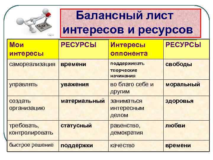 Балансный лист интересов и ресурсов Мои интересы РЕСУРСЫ Интересы оппонента РЕСУРСЫ самореализация времени поддерживать творческие начинания свободы управлять уважения во благо себе и другим моральный создать организацию материальный заниматься интересным делом здоровья требовать, контролировать статусный равенство, демократия любви быстрое решение поддержки качество времени