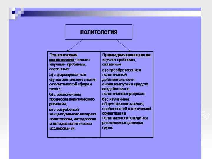 Политология - это наука о политической власти и управлении, о закономерностях Политология развития политических отношений и процессов, функционирования политических систем и институтов, политического поведения и деятельности людей Политическая теория Теория политическая теория и политического история идей участия или давления граждан политические партии, Международные отношения группы и ассоциации, международная участие граждан в политика, политика и управлении и международные администрации, организации, общественное мнение международное право Теория публичной (государственной) политики политические институты (конституция, центральное управление, региональное и местное управление, публичная администрация, экономические и социальные функции управления, сравнительный анализ политических институтов) ЭМПИРИЧЕСКИЙ ФУНДАМЕНТАЛЬНЫЙ ТЕОРЕТИЧЕСКИЙ ПРИКЛАДНОЙ 6