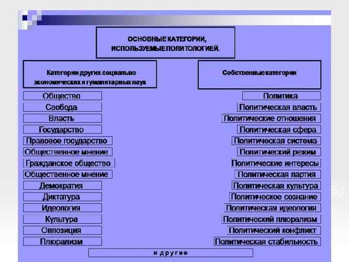 Категории политологии представляют собой основные, наиболее общие политологии фундаментальные понятия, отражающие существенные стороны ее предмета Выявить, определить, что есть политология Исследовать политические институты и субъекты политики Анализировать политический процесс Анализировать структуры и силы политиков Анализировать политическую систему Анализировать политическое сознание Политика Политические интересы Политическая партия Политическая элита Политическая деятельность Политическая власть Политический режим Политическая система общества Политическое лидерство Политические отношения Политическая культура