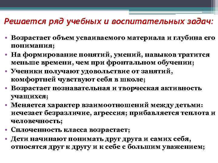 Решается ряд учебных и воспитательных задач: • Возрастает объем усваиваемого материала и глубина его понимания; • На формирование понятий, умений, навыков тратится меньше времени, чем при фронтальном обучении; • Ученики получают удовольствие от занятий, комфортней чувствуют себя в школе; • Возрастает познавательная и творческая активность учащихся; • Меняется характер взаимоотношений между детьми: исчезает безразличие, агрессия; прибавляется теплота и человечность; • Сплоченность класса возрастает; • Дети начинают понимать друга и самих себя, относятся друг к другу и к себе с большим уважением;