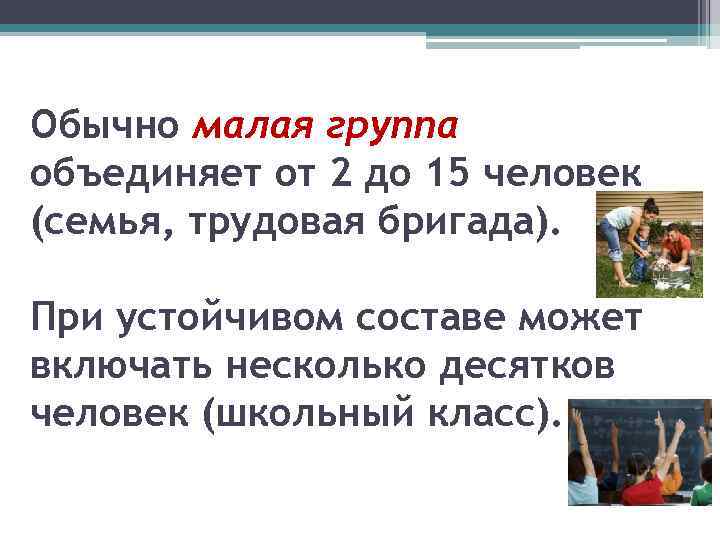 Обычно малая группа объединяет от 2 до 15 человек (семья, трудовая бригада). При устойчивом составе может включать несколько десятков человек (школьный класс).