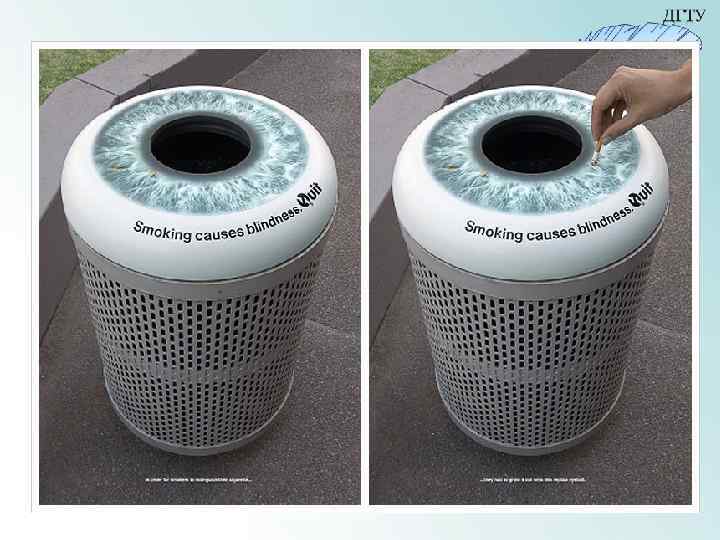 2) неординарное решение системы средств коммуникации с потребителем при проведении рекламной кампании. Может быть связано с потребителем (например, жидкокристаллические экраны на улицах, вмонтированные в напольное покрытие световые короба; провакационный маркетинг). 1 пример провокационной кампании: урны на улицах представлены в форме глазного яблока. Необычное воплощение вполне обыкновенной идеи действительно впечатляет. Слоган: «Курение вызывает слепоту» .