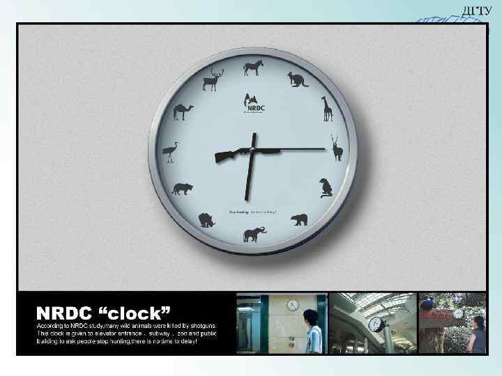 2 пример провокационной рекламы – иллюстрация фонда NRDC со слоганом: «Прекратите охоту. Нет времени откладывать» . Часы с изображениями животных вместо цифр и стрелками в форме охотничьего оружия были вывешены в наиболее проходимых местах (вокзалы, остановки автотранспорта). Данная реклама не может не служить лучшим образцом, так как у заядлых охотников она вызывает ассоциации, несовместимые с целевыми ( «Пора на охоту» );