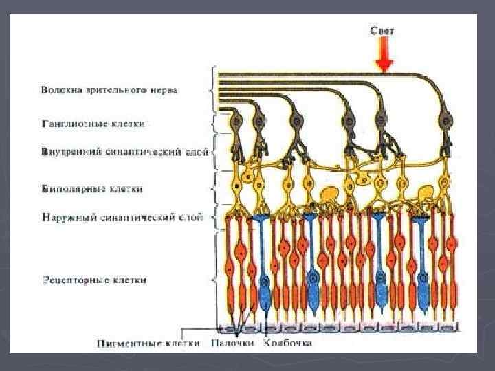 ХАРАКТЕРИСТИКА ОТДЕЛОВ ЗРИТЕЛЬНОГО АНАЛИЗАТОРА. Периферический отдел: рецепторы сетчатки. 1. I. фоторецепторы – палочки (110 -125 млн. ) и колбочки (6 -7 млн. ) II. слой биполярных клеток III. ганглиозные нервные клетки.
