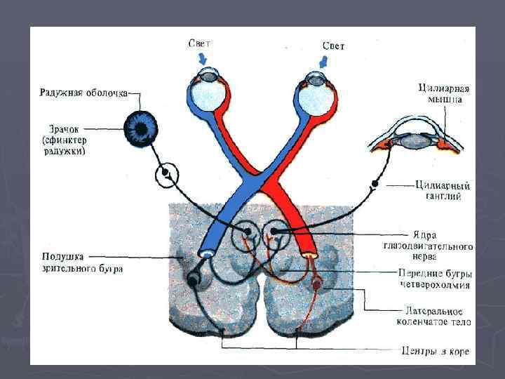 2. Проводниковый отдел: волокна зрительного нерва у основания мозга перекрест (хиазма) средний мозг (верхние бугры четверохолмия) промежуточный мозг (латеральные коленчатые тела). 3. Центральный отдел – затылочная доля коры больших полушарий, область шпорной борозды (fissura calcarina).