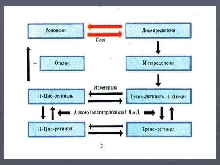 ЗРИТЕЛЬНЫЕ ПИГМЕНТЫ родопсин (зрительный пурпур). В палочках – В колбочках: – йодопсин: максимум поглощения в желной части спектра, - хлоролаб - максимум поглощения в зеленой части спектра, - эритролаб - максимум поглощения в красной части спектра. ФОТОХИМИЧЕСКИЕ РЕАКЦИИ В РЕЦЕПТОРАХ СЕТЧАТКИ. Родопсин – комплекс ретиналя (альдегид витамина А) и опсина (белка). Поглощение кванта света распад родопсина на ретиналь и опсин, изомеризация цис-ретиналя транс-ретиналь активация ионов Са 2+, изменение проницаемости для ионов Na+ возникновение рецепторного потенциала выделение медиатора ПД.
